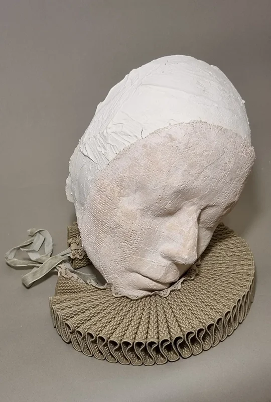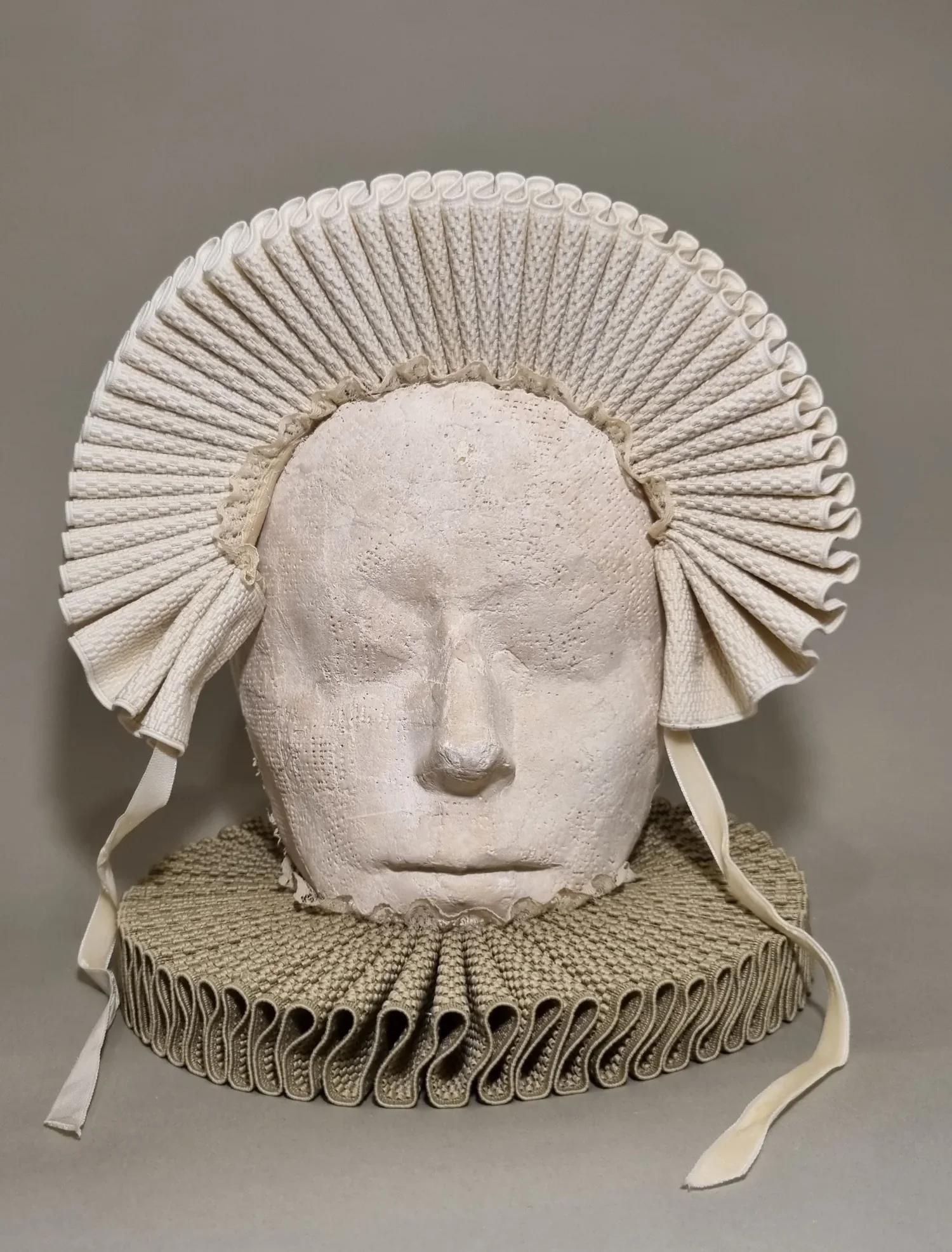 Plaster, fabric ruffle collar, oil paint